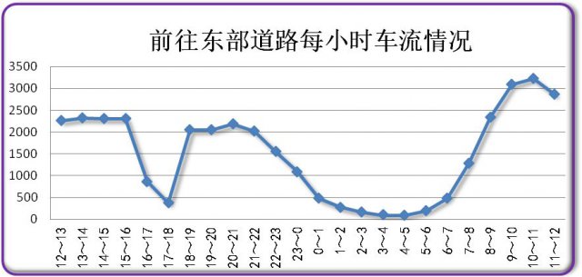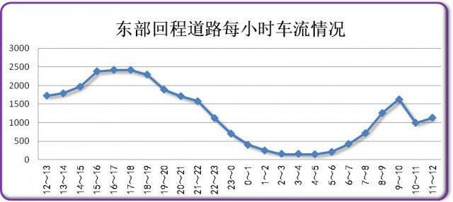 今日上午8時開始,東部回程的車輛增多,9時達到峰值,約1629輛。