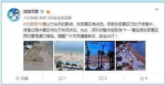 今日(9月25日)深圳市交警局宣布,由于臺風(fēng)"山竹"對東部景區(qū)破壞嚴(yán)重,目前部分景區(qū)仍在搶修中。交警蜀黍經(jīng)過綜合考慮,決定取消國慶期間前往東部的預(yù)約措施。
