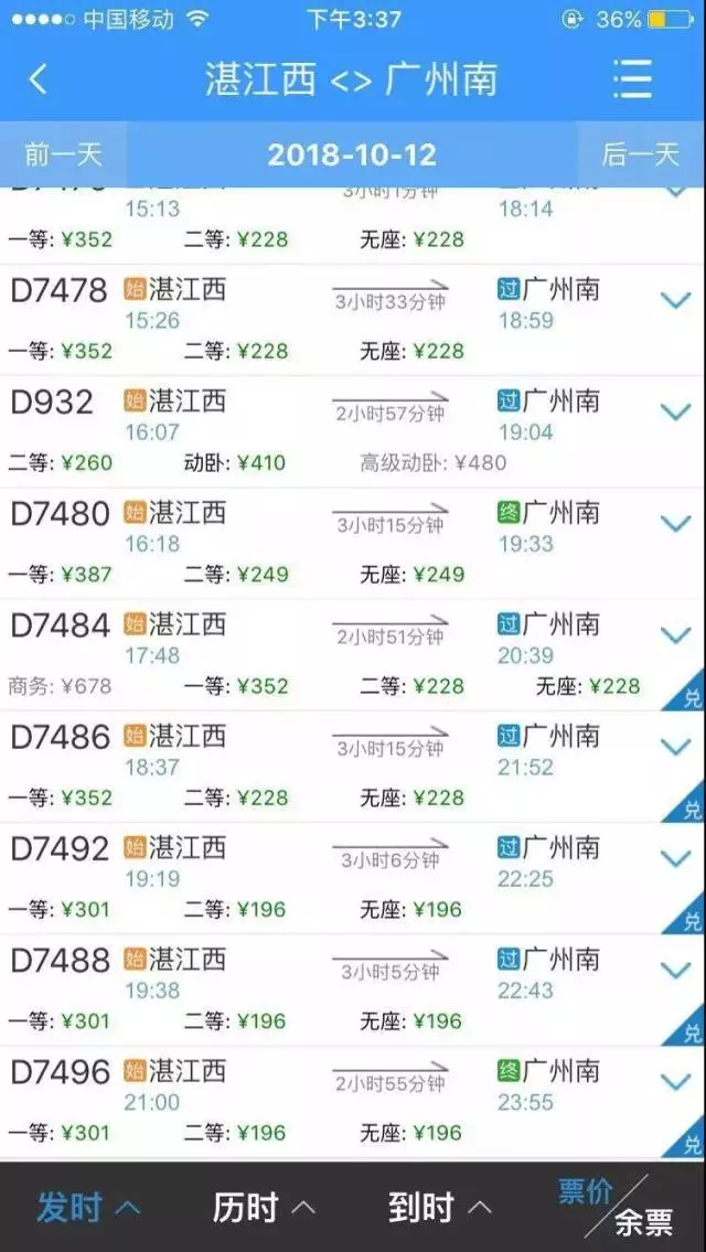 以10月19日廣州-珠海的票價(jià)來(lái)看,票價(jià)打折的車(chē)次發(fā)生了變化,D7601次的票價(jià)顯示為八折,其中二等座56元,比打折前便宜14元。原來(lái)打折的D7262車(chē)次恢復(fù)了原價(jià)。