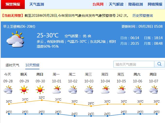 預(yù)計本周后期到國慶假期前中期,深圳以多云到晴天為主,9月29日 -10月2日晴朗干燥,10月3日 -4日多云,10月5日 -6日可能受副熱帶高壓和第25號臺風(fēng)外圍下沉氣流共同影響,天氣多云,午后有短時(雷)陣雨。