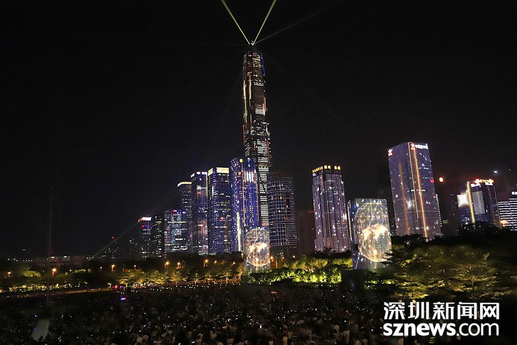 (三)第三篇章:創(chuàng)新之都。深圳是創(chuàng)新之都,是一座有著創(chuàng)新基因的城市。通過光影匯聚世界各地地標(biāo)建筑,代表全球創(chuàng)新要素匯聚深圳。飛機(jī)和高鐵代表了深圳便捷交通設(shè)施。基因工程、無人機(jī)和機(jī)器人代表深圳科技創(chuàng)新水平。
