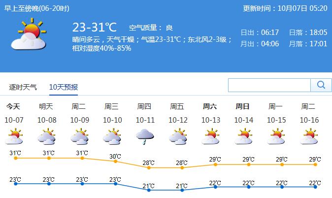 預計10月7-9日我市多云間晴天,氣溫23℃-31℃,空氣濕度將略有回升,但最小相對濕度仍在50%或以下,干燥天氣持續(xù)。未來三天天氣總體穩(wěn)定,氣溫波動不大,適合外出活動,戶外活動需多補充水分,適當做好護膚措施。