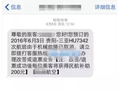 5分鐘之后,又收到一條稱航班被取消的短信