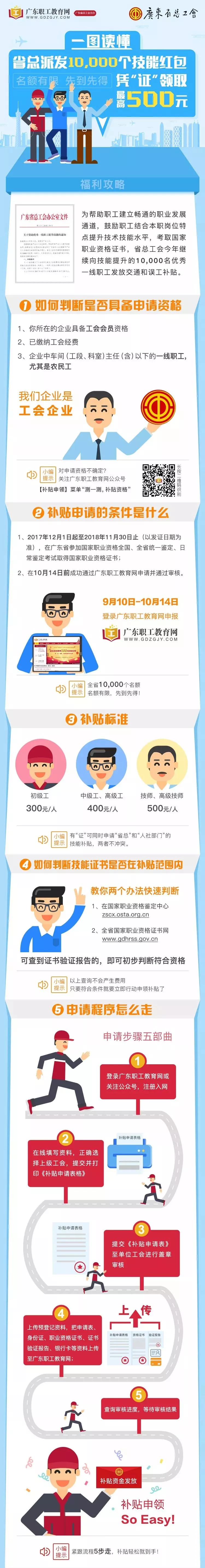 為提高我省產(chǎn)業(yè)工人隊(duì)伍素質(zhì),幫助更多產(chǎn)業(yè)工人提升技能水平,按照省總工會(huì)黨組會(huì)議通過(guò)的《廣東省總工會(huì)2018年產(chǎn)業(yè)工人大培訓(xùn)行動(dòng)組織實(shí)施方案》,省總工會(huì)繼續(xù)向10000名技能提升的優(yōu)秀產(chǎn)業(yè)工人發(fā)放交通和誤工補(bǔ)貼。取得職業(yè)資格證書(shū)可獲300~500元補(bǔ)貼,名額有限,先到先得!