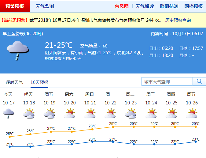 市氣象局預(yù)計(jì),17日深圳市以陰天間多云為主,有小雨,氣溫21-25℃,空氣漸趨干燥,其中18-20日沿海和高地有6-7級(jí)偏東風(fēng)。