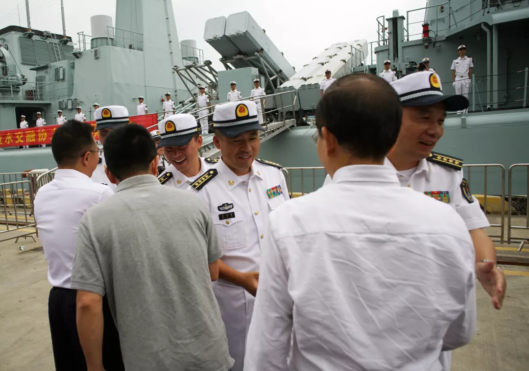 深圳市委副秘書長劉平生,市民政局局長廖遠(yuǎn)飛,南山區(qū)委常委、宣傳部部長廖子彬,南山區(qū)委常委、人武部部長彭耀玖,副區(qū)長謝炳文等領(lǐng)導(dǎo)代表市、區(qū)雙擁辦在碼頭上歡送深圳艦。南部戰(zhàn)區(qū)海軍副參謀長李曉巖少將,深圳艦所在某驅(qū)逐艦支隊(duì)副政委蔣軍大校,深圳艦艦長黃北奇大校,深圳艦政委陳永強(qiáng)上校等與深圳親人一一握手道別。