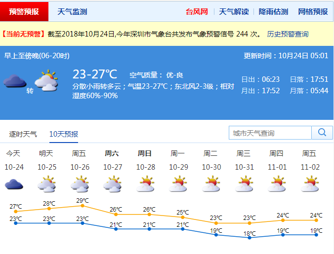 今日,鵬城以多云天氣為主,仍有分散小雨。早晚天氣較涼,最低氣溫在23℃左右,白天最高氣溫升至27℃左右。風(fēng)力和緩,市區(qū)內(nèi)維持2-3級的平均風(fēng)力,沿海地區(qū)平均風(fēng)力3-4級,最大陣風(fēng)達(dá)到6級。相對濕度適中,最小相對濕度為60%,最大濕度90%。