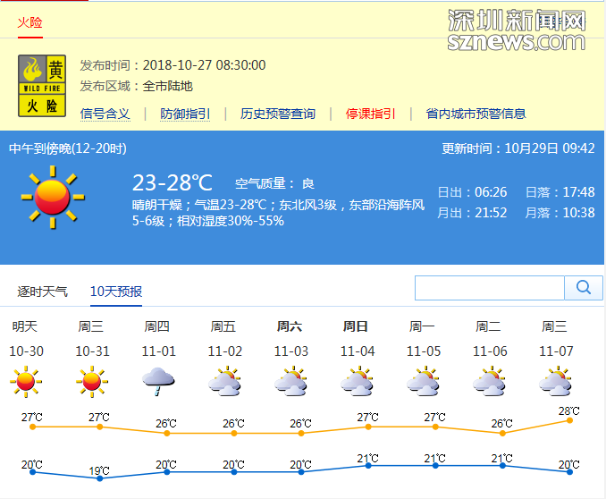 記者從深圳市氣象局了解到,29日,深圳市晴朗干燥;氣溫在20-28℃;東北風(fēng)3級,陣風(fēng)5-6級;相對濕度30%-70%?;痣U預(yù)警信號生效中。