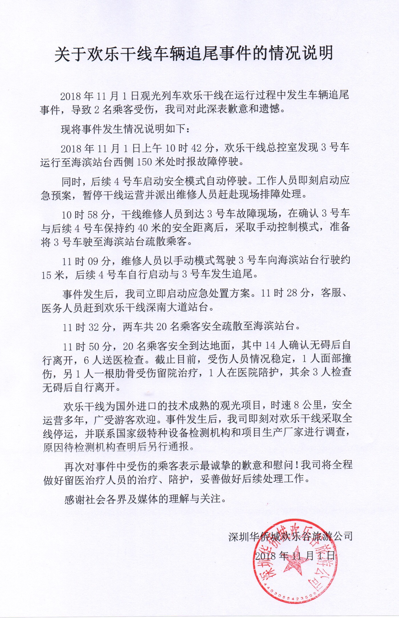 11月1日19時(shí),記者收到深圳華僑城歡樂(lè)谷旅游公司就此次事件發(fā)來(lái)的情況說(shuō)明。歡樂(lè)谷旅游公司在說(shuō)明中還原了事故發(fā)生的過(guò)程,并對(duì)受傷乘客表示歉意。