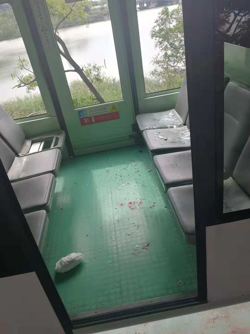 記者從歡樂(lè)干線觀光車上一位乘客拍攝的視頻中看到,這次撞擊將車身玻璃撞碎,玻璃渣掉落一地,中間還摻雜了血跡。坐在其中一列車上的乘客驚魂未定。可聽(tīng)到乘客在交流:“你撞到了嗎?”“我撞到膝蓋了?!痹谝曨l中,記者還看到有一人站在兩節(jié)列車中間,看似正在檢查車輛情況,像是工作人員,他說(shuō):“我也沒(méi)想到這個(gè)會(huì)撞上來(lái)。”