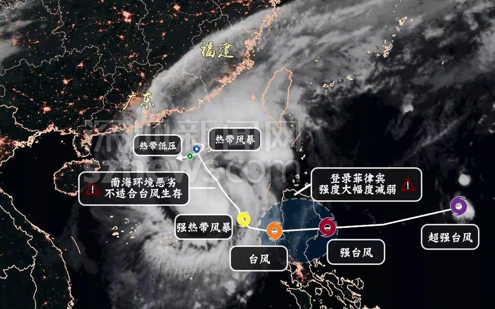深圳市氣象局發(fā)布的玉兔從超強(qiáng)臺(tái)風(fēng)到減弱為熱帶低壓圖