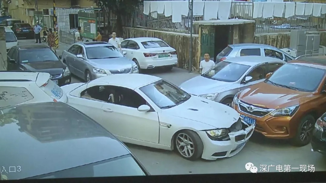 從監(jiān)控畫面中可以看到,粵E牌白色寶馬小車,在原本就擁擠的停車路段內(nèi),不停地前進倒退,走著奇怪的路線,在倒車時他接連將停放路旁的車輛撞了個遍,隨后便卡在了路中。
