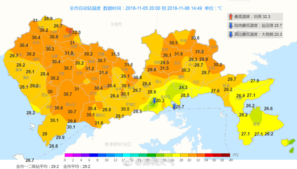 深圳氣象局于11月5日20時(shí)發(fā)布全市自動(dòng)站溫度