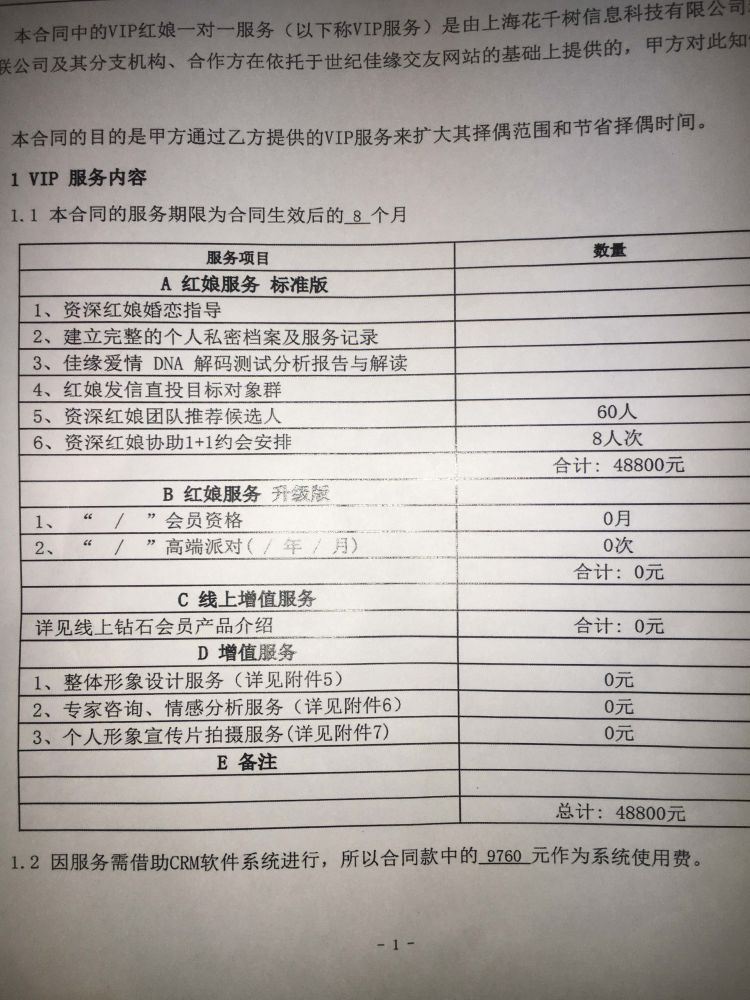 今年2月27日,劉小姐與世紀佳緣簽訂了一份繳款4.88萬的紅娘服務合同。合同服務期限為8個月,合同將根據(jù)其擇偶標準,由系統(tǒng)推薦60位候選人,其中紅娘協(xié)助線下約會安排8人次。此外,合同還包含三項增值服務,包括整體形象設計,專家咨詢、情感分析服務和個人宣傳片服務。