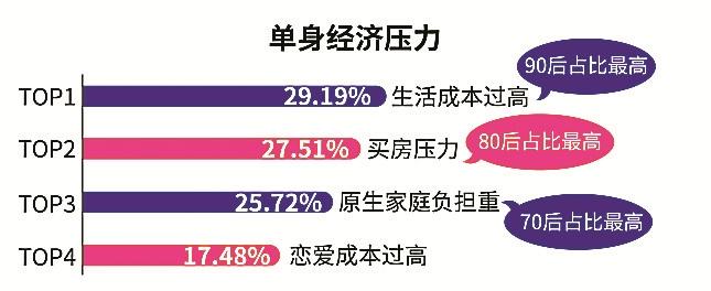 脫單難點(diǎn)中的經(jīng)濟(jì)壓力層面分析發(fā)現(xiàn),生活成本過高是影響脫單的最大單身壓力,其次是買房壓力,原生家庭負(fù)擔(dān)重以及戀愛成本過高。