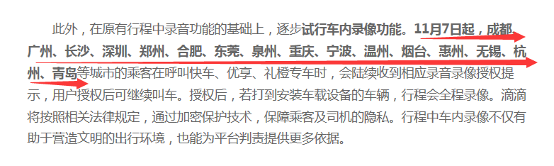 11月7日起,滴滴升級安全措施,在深圳等城市試行車內錄像功能