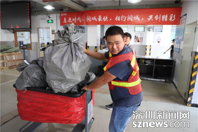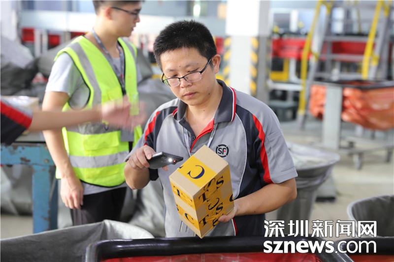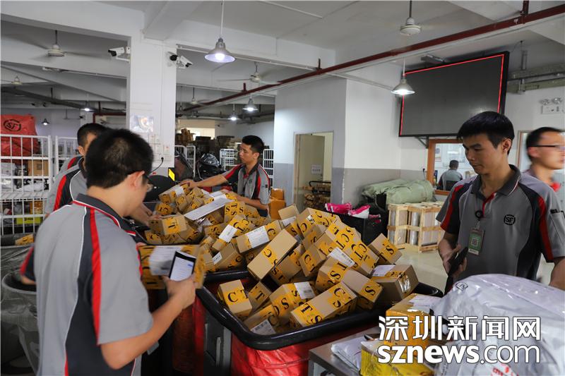 忙碌的田貝營運部內(nèi),順豐員工正在搬運包裹
