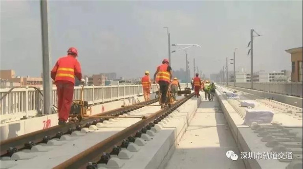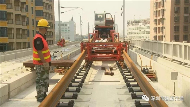 從施工現(xiàn)場可以看到,鋪軌機把長軌放入無碴道床就位,當鋼軌最后精準就位后,要求正負誤差不超過1毫米。目前鋪軌進度至少每天7公里,11日上午從金沙站開始不停歇作業(yè),到下午兩點鋪軌作業(yè)已臨近深圳。項目建設者表示,大約本月20號鋪設到深圳機場北站。