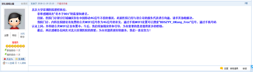 深圳新聞網(wǎng)11月20日訊(記者 劉婷)“北大深圳醫(yī)院竟然沒(méi)有公共WiFi?令人難以置信!”近日有網(wǎng)友“老木子001”在深圳論壇發(fā)帖稱(chēng),使用手機(jī)微信付費(fèi)時(shí),發(fā)現(xiàn)北大深圳醫(yī)院居然沒(méi)有公共無(wú)線網(wǎng)絡(luò)。(網(wǎng)帖地址:https://szbbs.sznews.com/thread-3821767-1-1.html)。