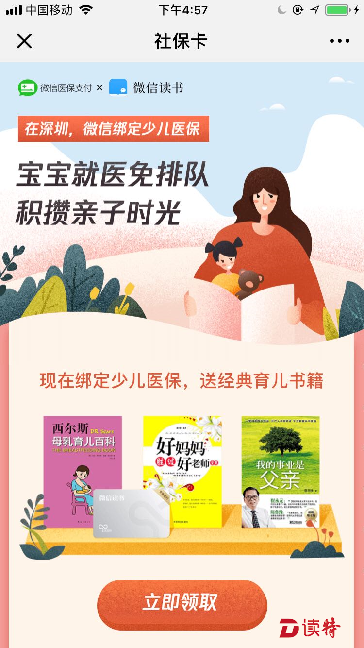 微信綁定少兒社保卡,領(lǐng)取微信讀書大禮包。