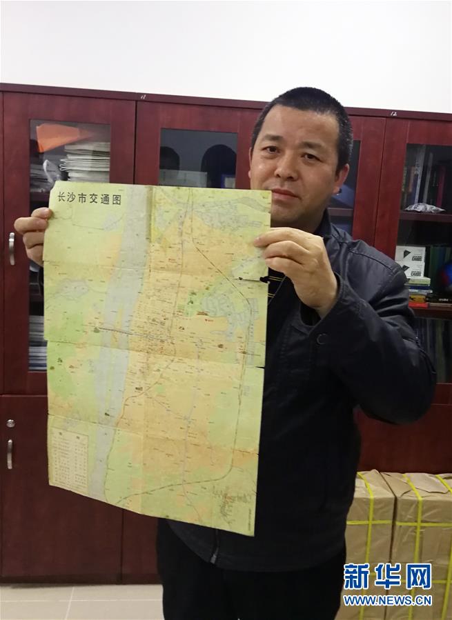 10月23日,蔣連軍向記者展示他收藏的改革開放初期的長(zhǎng)沙城區(qū)地圖。 湖南地圖出版社注冊(cè)測(cè)繪師蔣連軍愛好地圖收藏,累積了40多張40年來多個(gè)版本的長(zhǎng)沙城區(qū)地圖。10月23日,記者看到了這些地圖,它們直觀呈現(xiàn)了改革開放40年來長(zhǎng)沙城的變遷發(fā)展。 新華社記者 段羨菊 攝