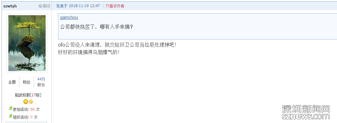 “福田河的水質(zhì)很好,但大量的故障單車停放在路邊實在是煞風景。”網(wǎng)友“szwtyh”認為,不應(yīng)該讓這些單車礙了深圳的城市景觀,掃了市民欣賞福田河水的興致。