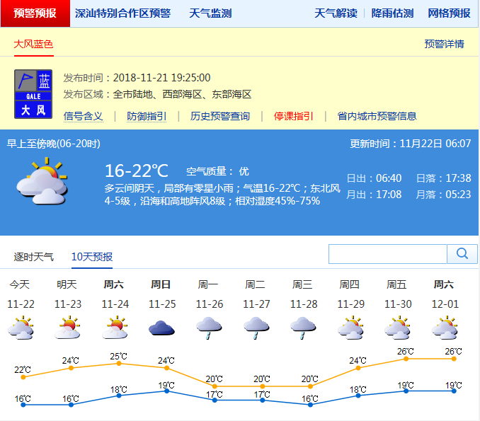 據(jù)氣象測(cè)報(bào),20日夜間到21日白天,深圳多云,局地有零星小雨,早晨最低氣溫21-23℃,白天最高氣溫27-29℃。但從21日夜間開始,深圳受冷空氣影響,陰天有分散小雨,沿海和高地陣風(fēng)7-8級(jí),天氣顯著轉(zhuǎn)涼;22日午后風(fēng)力逐漸減弱,轉(zhuǎn)多云;23-24日,以晴天到多云天氣為主,可見陽(yáng)光,早晚清涼;25日云量增多,偶有分散小雨;26-28日受冷空氣補(bǔ)充影響,陰天有小雨。