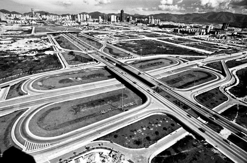 1992年,中心區(qū)四橋一廣場進(jìn)入緊張施工,圖為金田立交橋的施工情景,背景是蓮花山。 馬樹華 攝