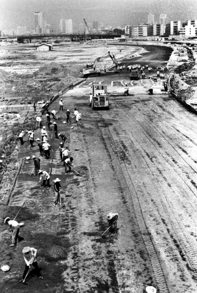 1993年5月,中心區(qū)四橋一廣場(chǎng)工程施工進(jìn)入最后沖刺,圖為建設(shè)者們?cè)谶M(jìn)行路面石粉平整施工的情景。馬樹華 攝