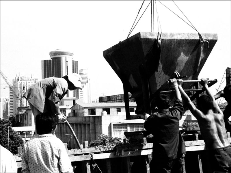 1985年,建設者們在深圳火車站人行天橋施工。 呂翔 攝