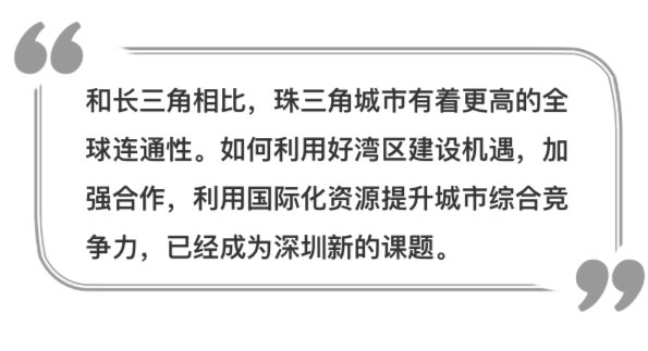 一方面,深圳要開展更大范圍、更高水平、更深層次的全球合作,提升在全球網(wǎng)絡中的地位和能級,增強對經(jīng)濟資源要素的配置能力,加深與全球市場的融合程度。另一方面,深圳也應從本土優(yōu)勢和特色出發(fā),進一步融入國家開放格局,構筑良性的城市-腹地關系,培育內(nèi)生的經(jīng)濟、產(chǎn)業(yè)、設施、資源等支撐體系,通過區(qū)域協(xié)同發(fā)展,增強全球競爭力。