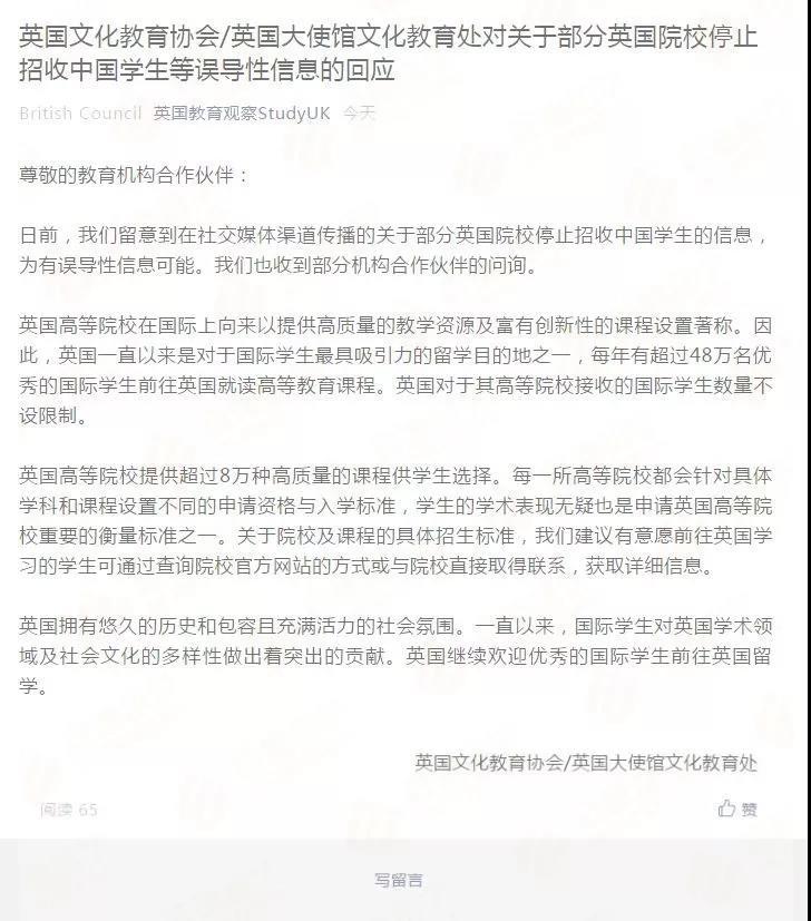 記者發(fā)現,英國文化教育協會/英國大使館文化教育處對關于部分英國院校停止招收中國學生這一信息已做出官方回應:他們留意到在社交媒體渠道傳播的關于部分英國院校停止招收中國學生的信息,為有誤導性信息可能。