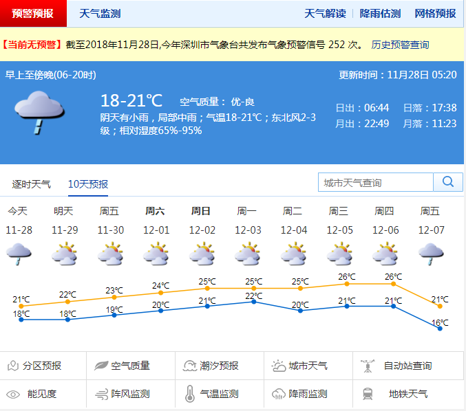 深圳市氣象局預計,29日零星小雨轉多云,可見陽光;30日到12月1日陰天間多云,偶有零星小雨;2到3日,多云,可見陽光。