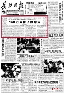 《140萬雙襪子的命運》于1997年7月30日首發(fā)于長江日報一版,獨家報道了武漢襪廠倉庫里積存了兩火車皮襪子,其中最長的沉睡了10年,但是面對眾多商家訂單,工廠卻長年不肯“吐貨”,商家開價越來越低,襪子在一天天貶值。此報道一出,轟動全國,多家媒體轉(zhuǎn)載,并獲得第八屆中國新聞獎一等獎。