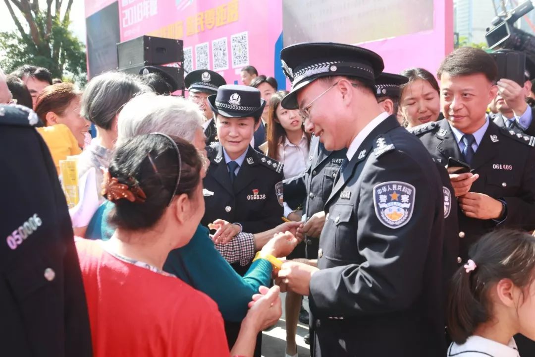 儀式后,深圳市副市長(zhǎng)、公安局長(zhǎng)徐文?,F(xiàn)場(chǎng)為來參觀活動(dòng)的老人和小孩佩戴了“黃手環(huán)”,陽光的顏色,給人溫暖,讓人安心,傳遞了正能量。