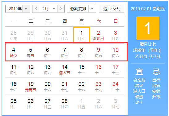 2019年春節(jié)是2月5日(星期二),根據(jù)規(guī)定春節(jié)法定放假時間是初一到初六,調(diào)休7天。2019年2月2日、2月3日需上班調(diào)休。