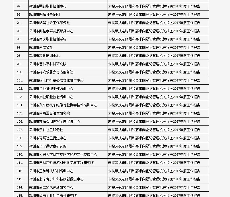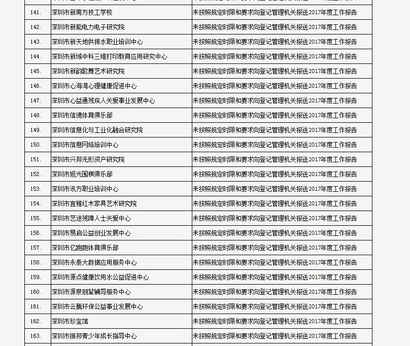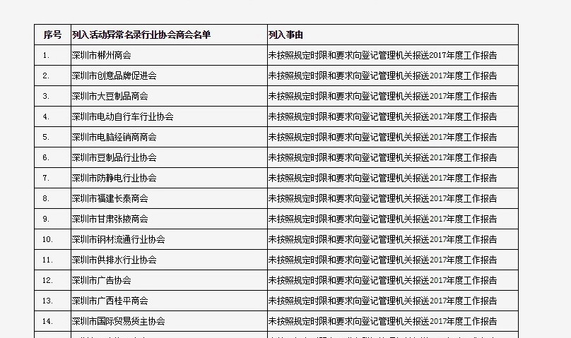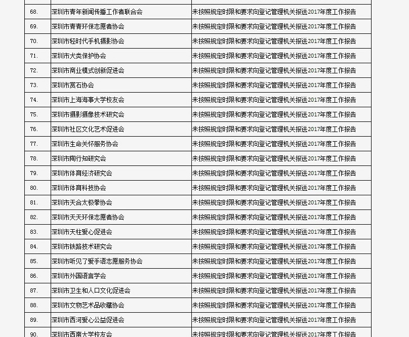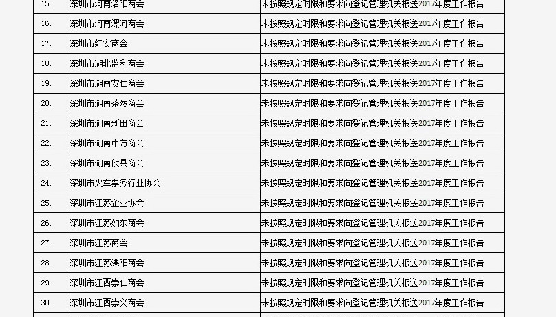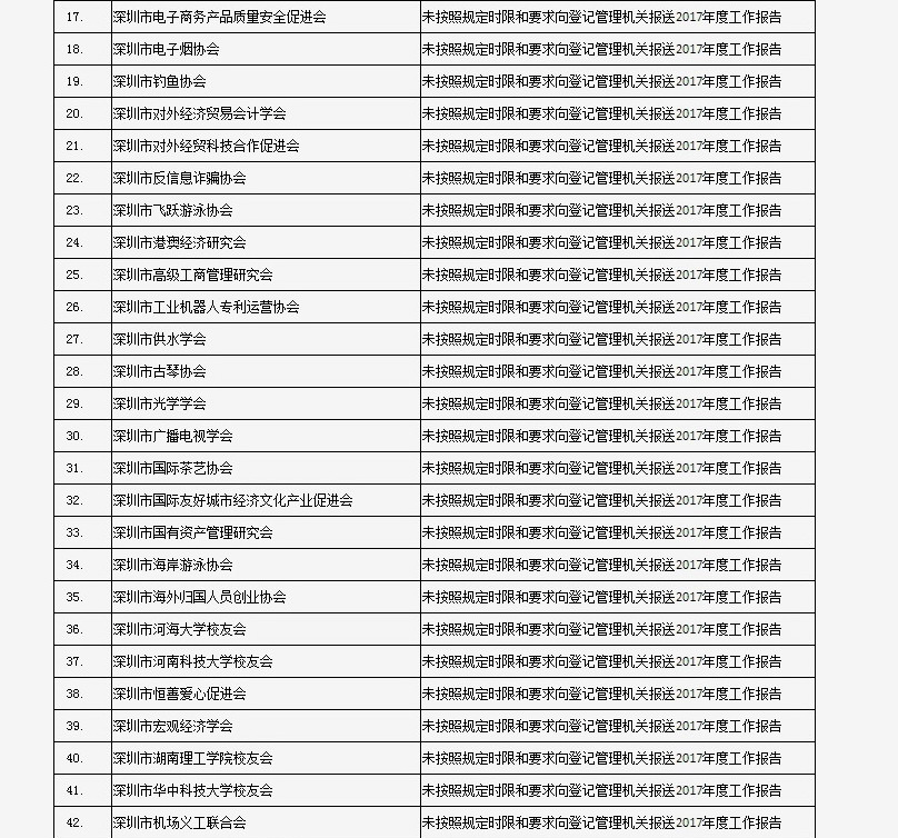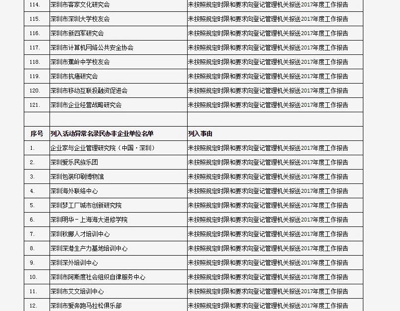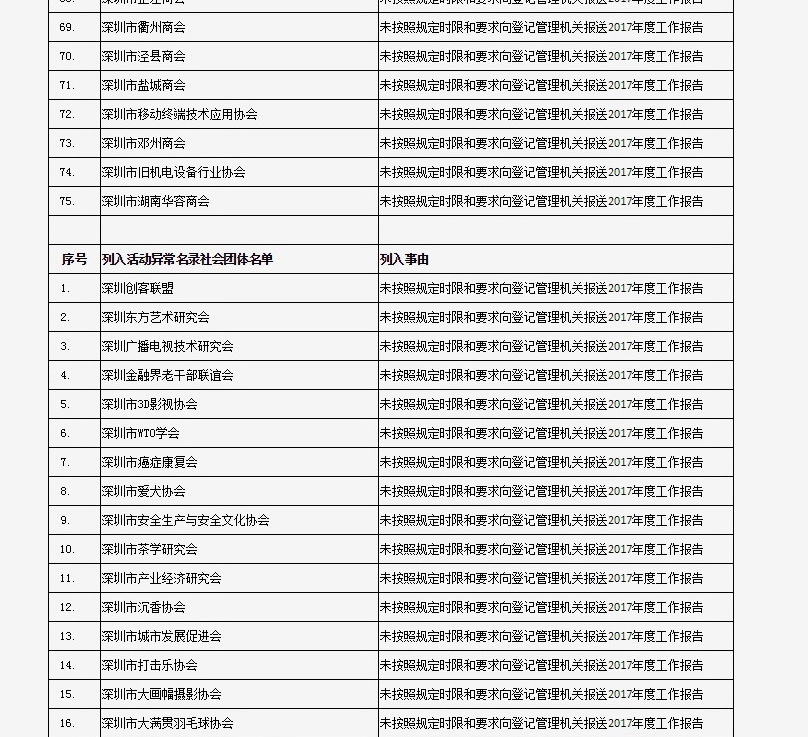 據(jù)深圳市民政局通報,深圳市華中科技大學校友會和深圳市深圳大學校友會等121家社會團體、深圳市郴州商會等75家行業(yè)協(xié)會商會、企業(yè)家與企業(yè)管理研究院(中國·深圳)等201家民辦非企業(yè)單位、深圳市明園慈善基金會等20家基金會,經查“未按照規(guī)定時限和要求向登記管理機關報送2017年度工作報告”,違反了《社會組織信用信息管理辦法》《深圳經濟特區(qū)行業(yè)協(xié)會條例》的相關規(guī)定,被列入活動異常名錄名單。完整版名單已在“深圳民政在線”公布。