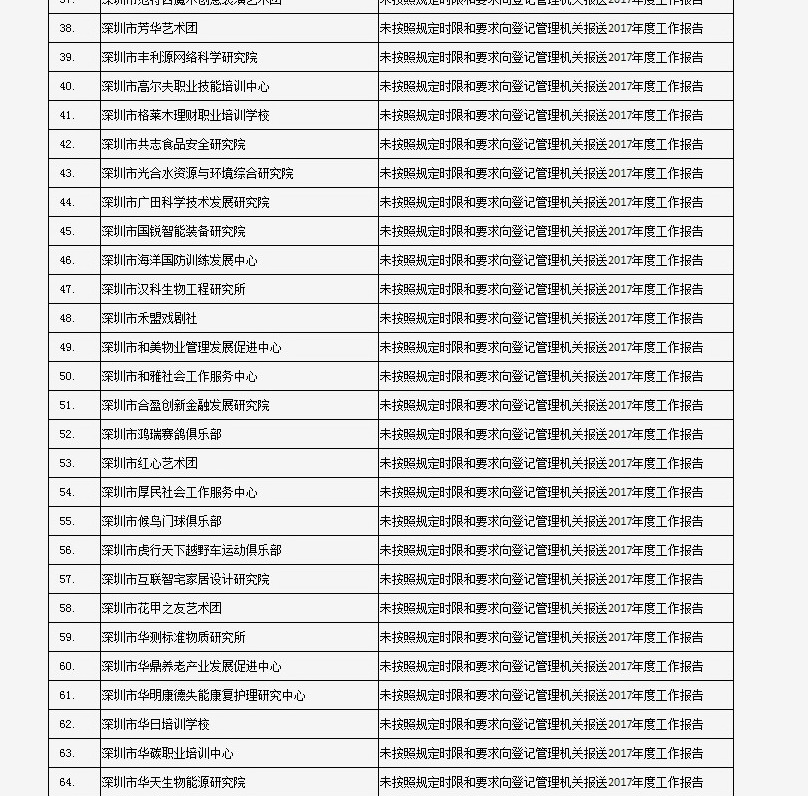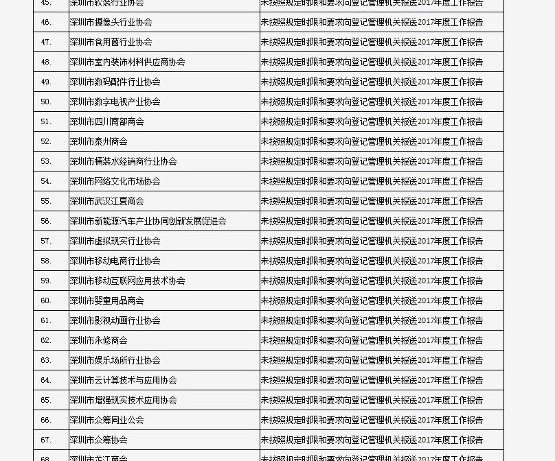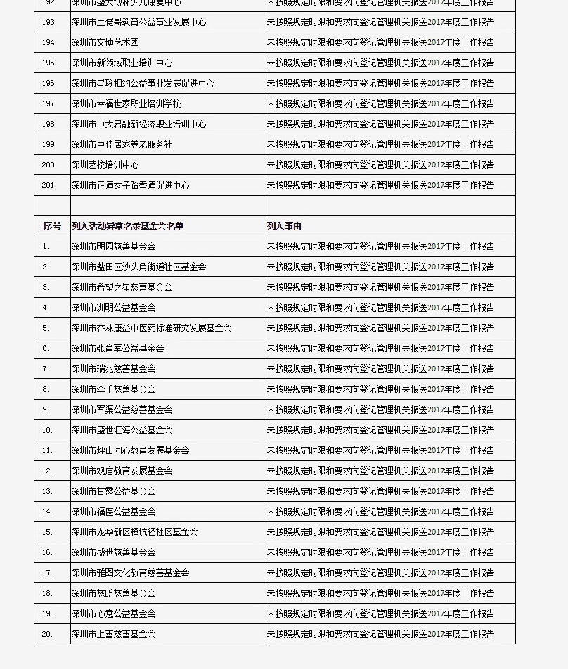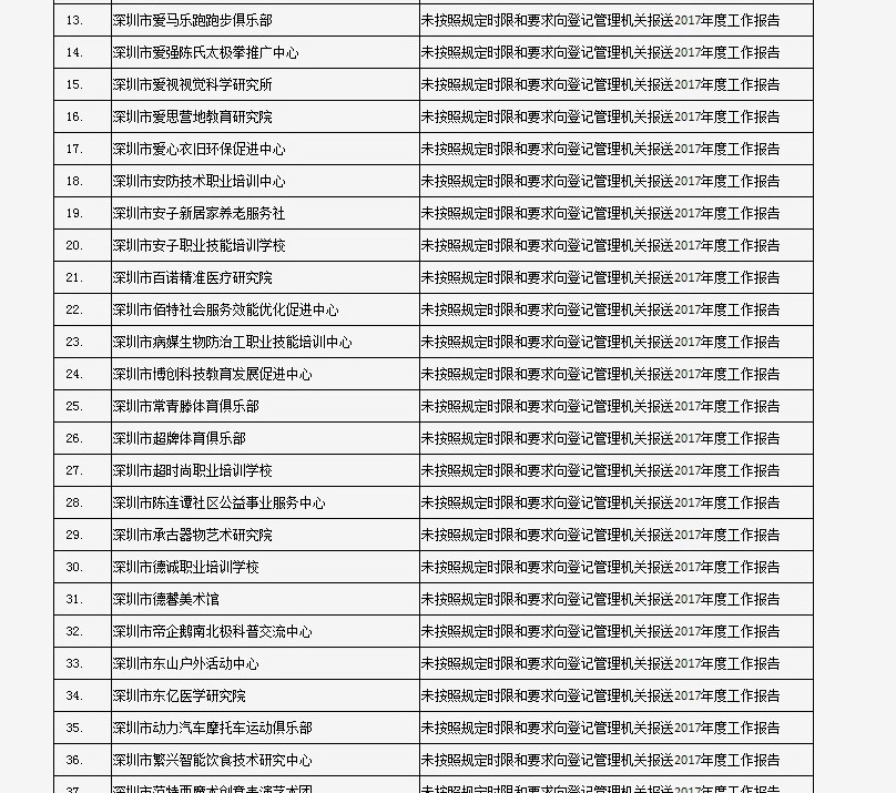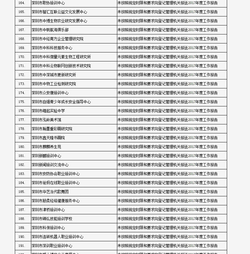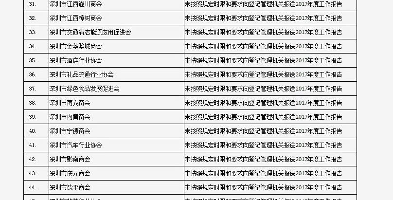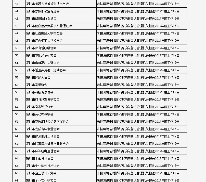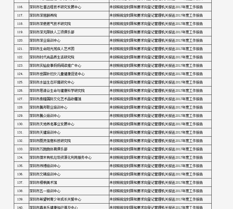 據(jù)深圳市民政局通報,深圳市華中科技大學校友會和深圳市深圳大學校友會等121家社會團體、深圳市郴州商會等75家行業(yè)協(xié)會商會、企業(yè)家與企業(yè)管理研究院(中國·深圳)等201家民辦非企業(yè)單位、深圳市明園慈善基金會等20家基金會,經查“未按照規(guī)定時限和要求向登記管理機關報送2017年度工作報告”,違反了《社會組織信用信息管理辦法》《深圳經濟特區(qū)行業(yè)協(xié)會條例》的相關規(guī)定,被列入活動異常名錄名單。完整版名單已在“深圳民政在線”公布。