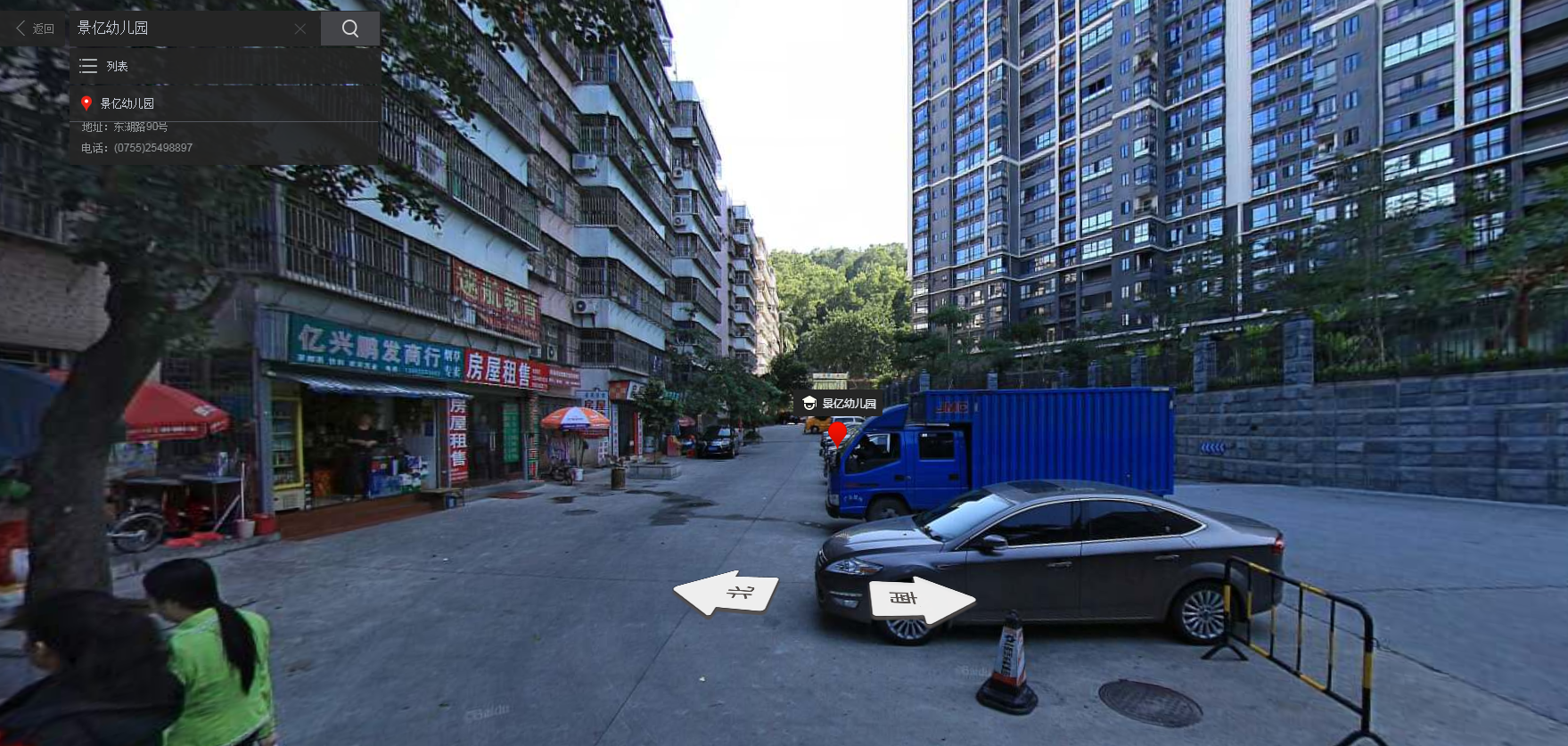 針對(duì)網(wǎng)帖的爆料內(nèi)容,記者查詢了百度全景地圖,以景億幼兒園作為第一視角,正對(duì)其大門(mén)的道路如該網(wǎng)友所言,一半以上被用來(lái)停車,而另一半則用來(lái)給行人和車輛共同通行。