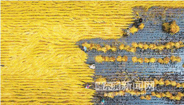 在五常營(yíng)城子村一望無(wú)垠的稻田上,農(nóng)民們正在手工收割水稻。