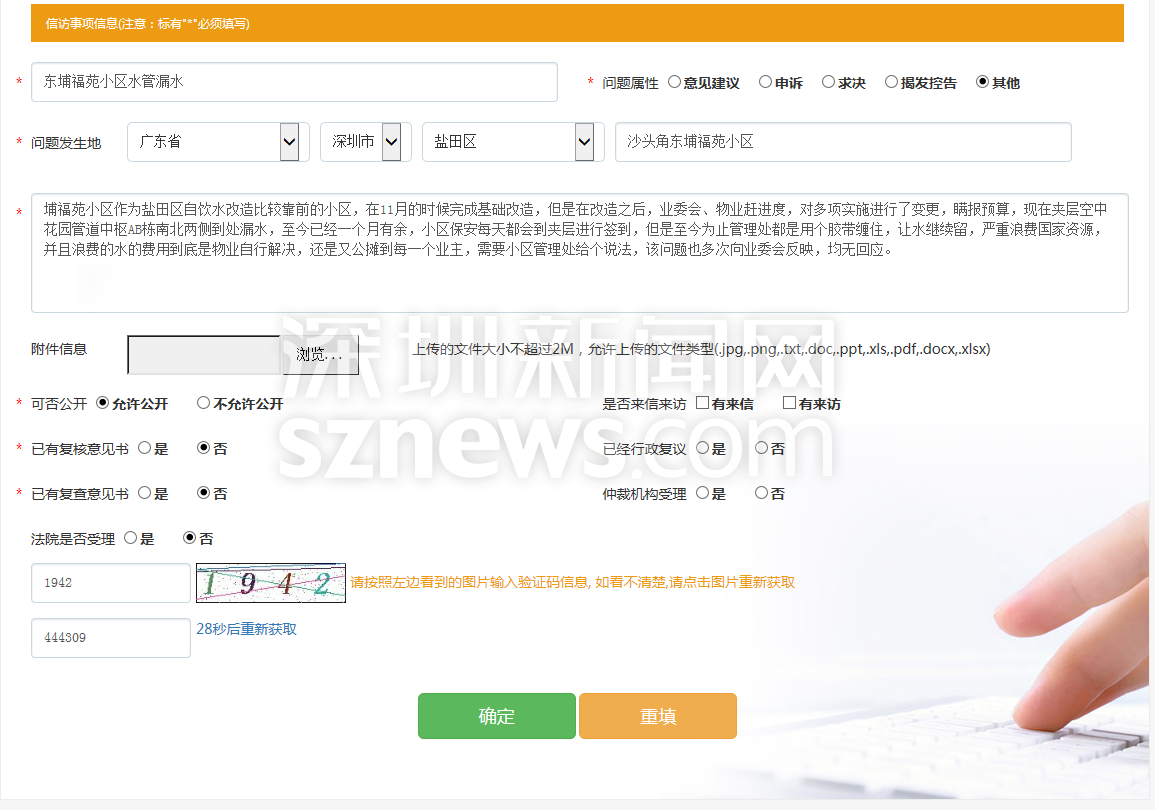 記者通過鹽田政府在線網站的信訪渠道寫信反饋情況,顯示提交成功