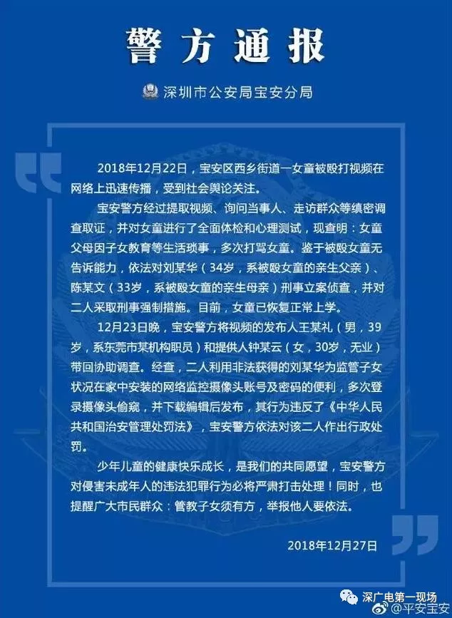 12月27日晚19時許深圳警方通報“父母虐童”案處理結果:女童父母被采取刑事強制措施 視頻發(fā)布人被行政處罰