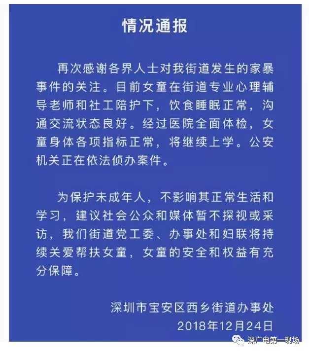 12月24日晚,深圳市寶安區(qū)西鄉(xiāng)街道辦通報表示:目前女童在街道專業(yè)心理輔導老師和社工陪護下,飲食睡眠正常,溝通交流狀態(tài)良好。經過醫(yī)院全面體檢,女童身體各項指標正常,將繼續(xù)上學。