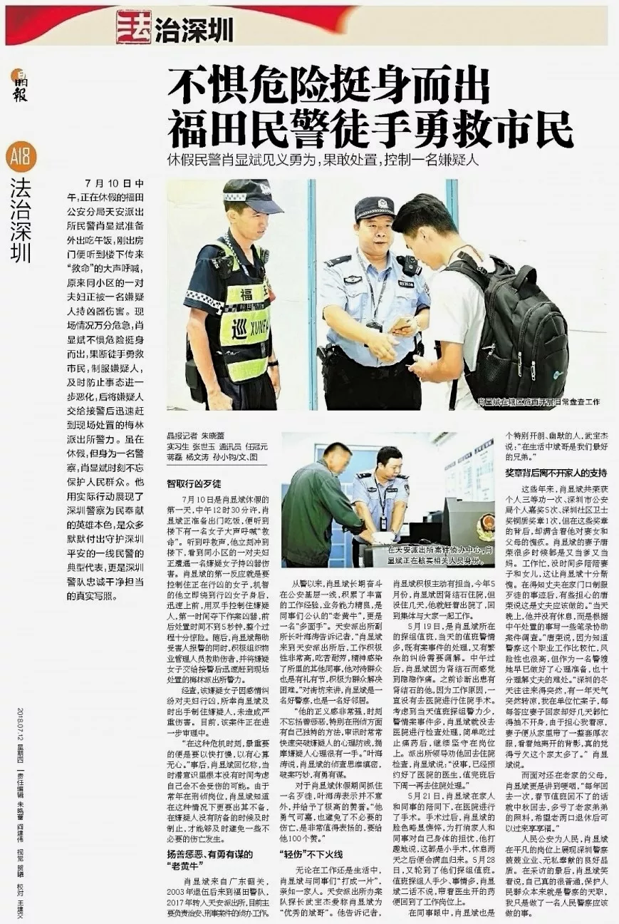 ★★天安派出所民警肖顯斌休假第一天,面對突發(fā)持刀行兇險情,挺身而出,果斷處置,化險為夷。英雄的壯舉并非偶然,源自平時工作的盡忠職守,源自人民警察的責(zé)任與使命。