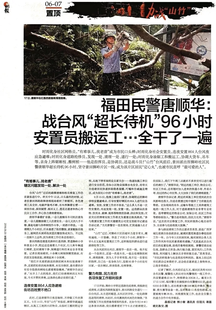 ★★深圳遭遇三十年來最強臺風(fēng)“山竹”襲擊,景田派出所民警唐順華堅守景田獅嶺片區(qū),頂風(fēng)冒雨搶險救災(zāi),處理倒伏樹木、清理路障,連續(xù)90多個小時沒有回家。