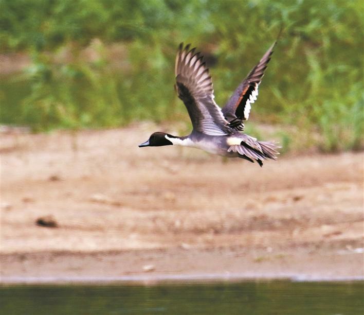 一只針尾鴨飛過(guò)3號(hào)魚(yú)塘上空。