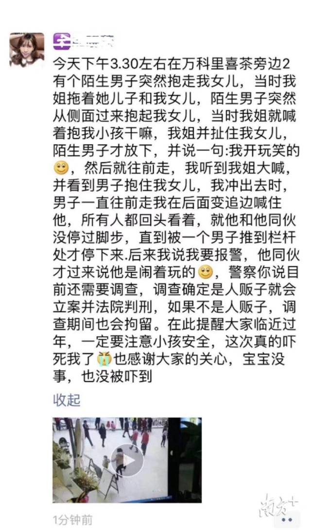 2019年1月1日下午,一位市民發(fā)朋友圈表示:在萬(wàn)科里逛街時(shí),一名陌生男子突然上前抱走她的女兒,經(jīng)過(guò)拉扯制止,該男子才放下孩子。隨后,該女士報(bào)警,而男子則表示自己是鬧著玩的。