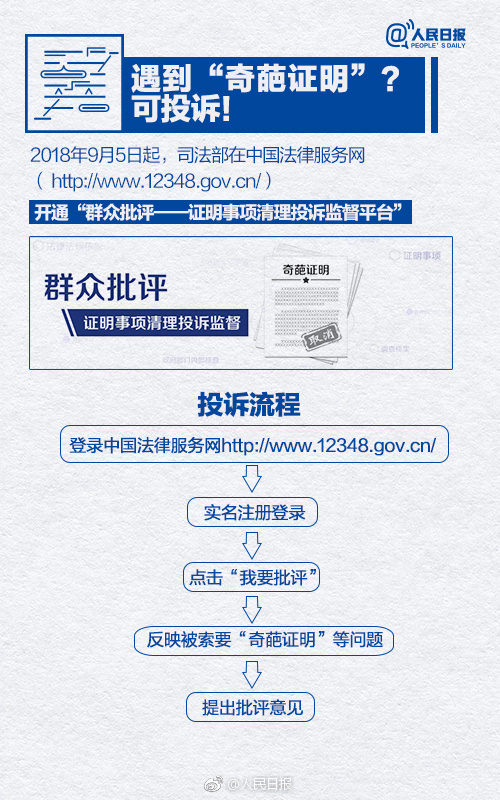 遇到這樣的"奇葩證明"可在司法部開通的網(wǎng)上投訴平臺(tái)上進(jìn)行投訴,實(shí)名登錄后即可反映意見,各地方被要求在15天內(nèi)反饋。