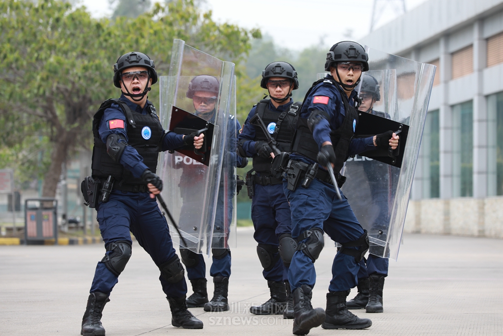 隊(duì)列會(huì)操步履整齊劃一,動(dòng)作規(guī)范有力,擒敵拳演練虎虎生威,遒勁剛猛,展現(xiàn)了深圳監(jiān)獄警察訓(xùn)練有素、團(tuán)結(jié)一致的團(tuán)隊(duì)風(fēng)采。特警隊(duì)員壓軸表演的警棍盾牌操,動(dòng)作迅速,合作默契,彰顯深圳監(jiān)獄警察過(guò)硬的專業(yè)本領(lǐng)和團(tuán)結(jié)協(xié)作的團(tuán)隊(duì)精神。值得一提的是,在9個(gè)隊(duì)列中,有1個(gè)隊(duì)列全部由女警組成,她們聲音洪亮,英姿颯爽,巾幗不讓須眉,是深圳監(jiān)獄警察團(tuán)隊(duì)中一道亮麗的風(fēng)景。