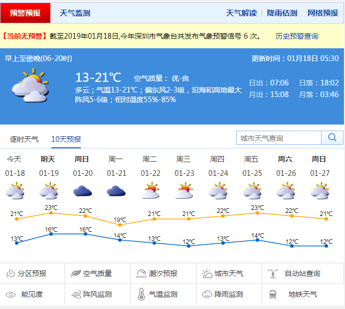 深圳新聞網(wǎng)2019年1月18日訊(記者 陳婕)1月18日,深圳早上最低氣溫普遍在12-13℃,穿少了的同學(xué)是否在上班時(shí)瑟瑟發(fā)抖了?這兩天是洗洗曬曬的好日子,然后就可以準(zhǔn)備過年了,預(yù)計(jì)今年深圳市不入冬了,畢竟沒有冬天的深圳,是常規(guī)操作。